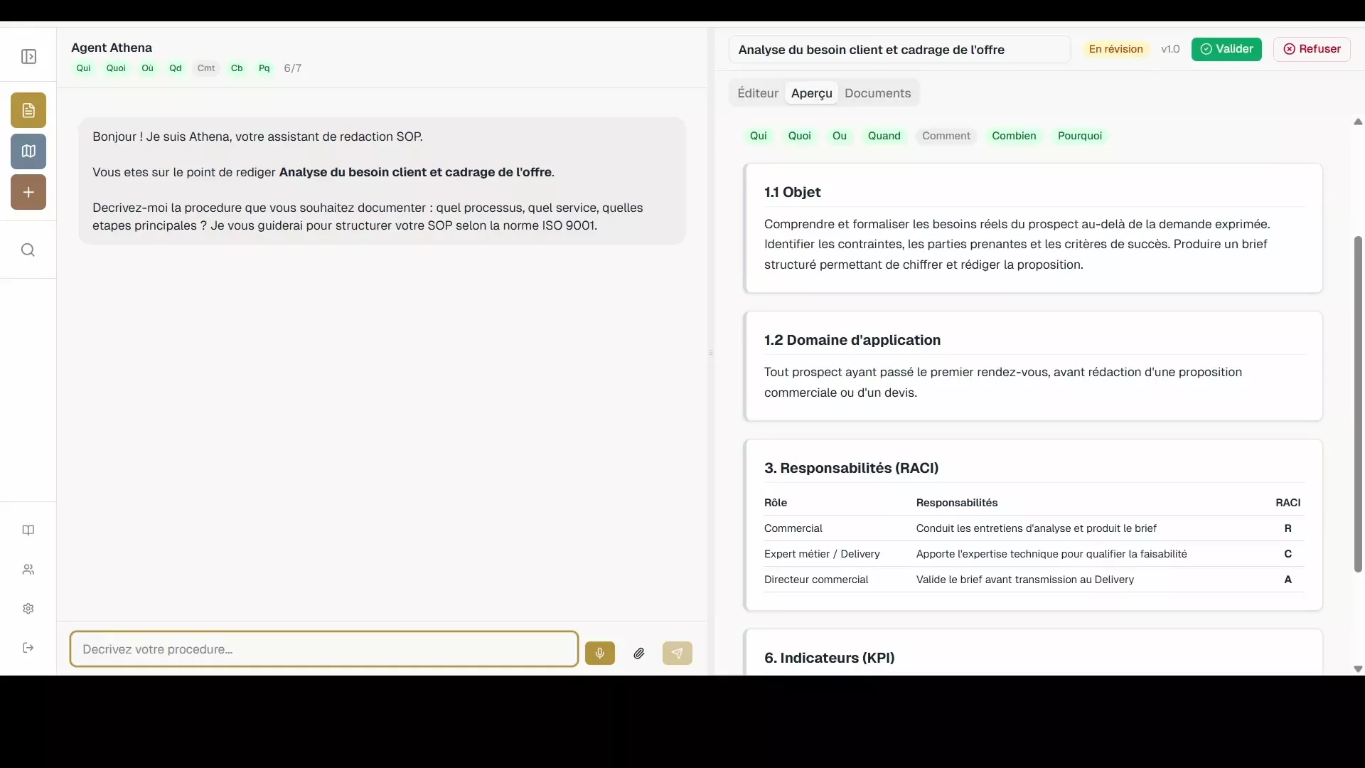 L'IA structure chaque méthode selon le cadre ISO 9001. Aucune compétence qualité requise.